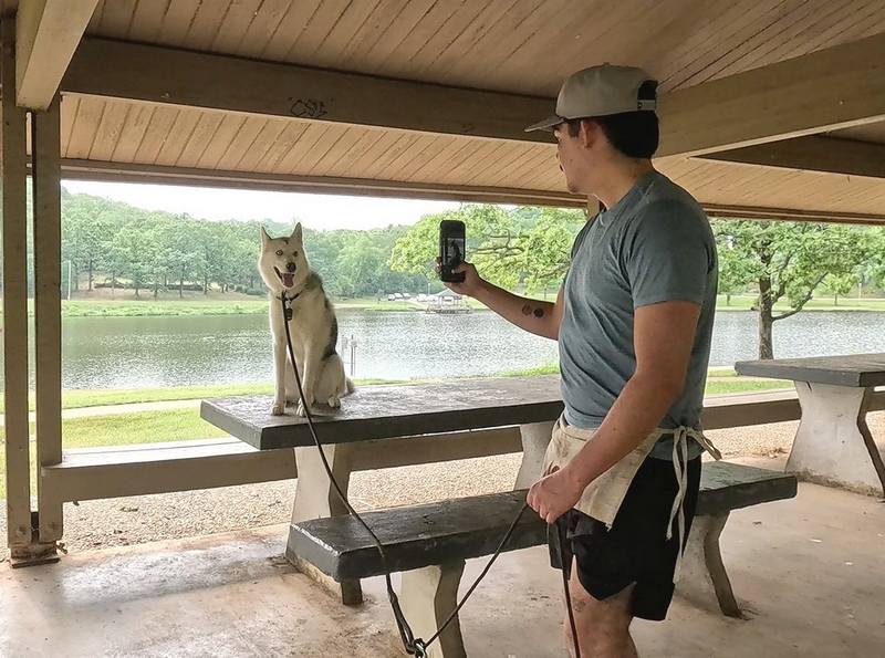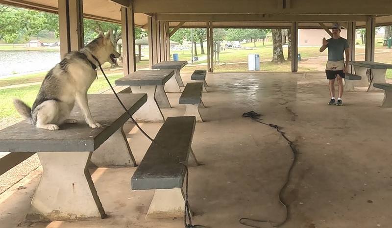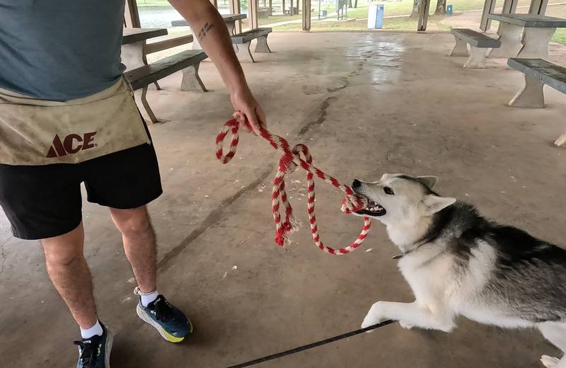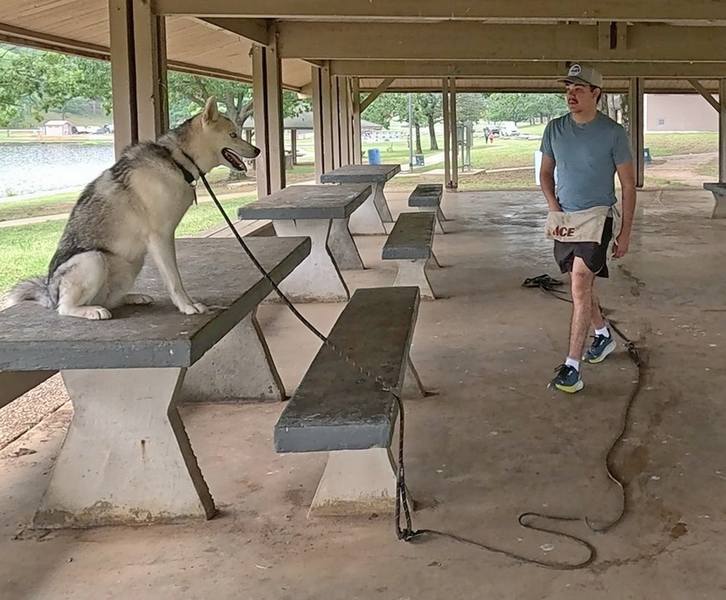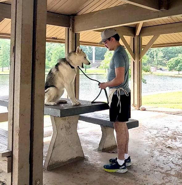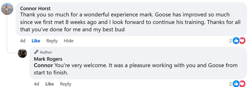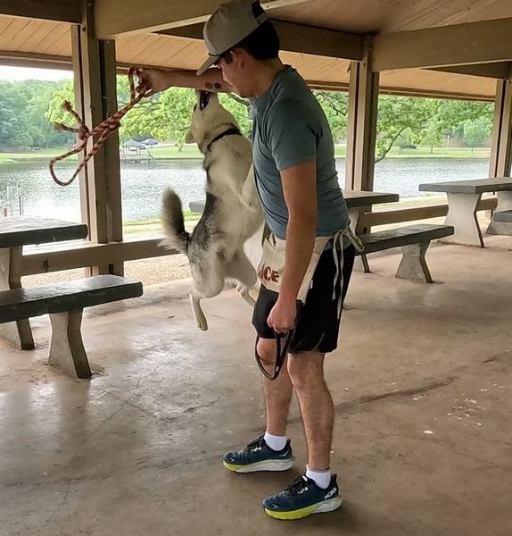 Goose was a barrel of fun to work with. Intelligent, energetic, willful, and ….. sometimes a showoff. Not surprising for a Husky. Conner stayed the course for this fun-loving dog, and emerged with much more insight, and a dog that knew his obedience commands.