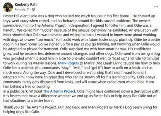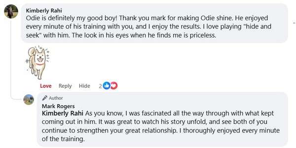 During the course of his training, and living with Kim, Odie underwent a remarkable transformation. My most common description of Odie was and is, ‘Brilliant’. Kim adopted Odie during his time training.